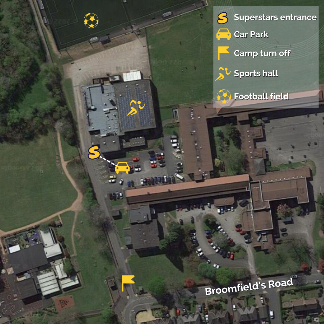 All Drop offs and Pick ups at Broomfield take place to the right hand side of the main building entrance. We kindly ask for safeguarding reasons that no parent is to enter the sports hall at any point, a Superstars Coach will welcome you and your child before taking them into camp.