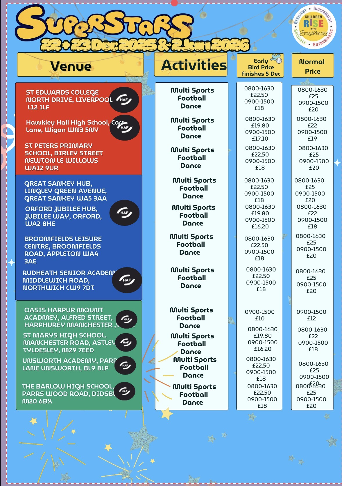 All our staff at Superstars are DBS checked and have extensive knowledge in their field whether that be multi-sports, dance or any specialist activities we are offering on that particular day/week. Each member of staff ensure that your child’s day is structured, safe and engaging with the flexibility for the child to choose their activity at any given time. Many of our workers at our centres have experience working in primary school and high school settings and fully understand what children of these age brackets require.
