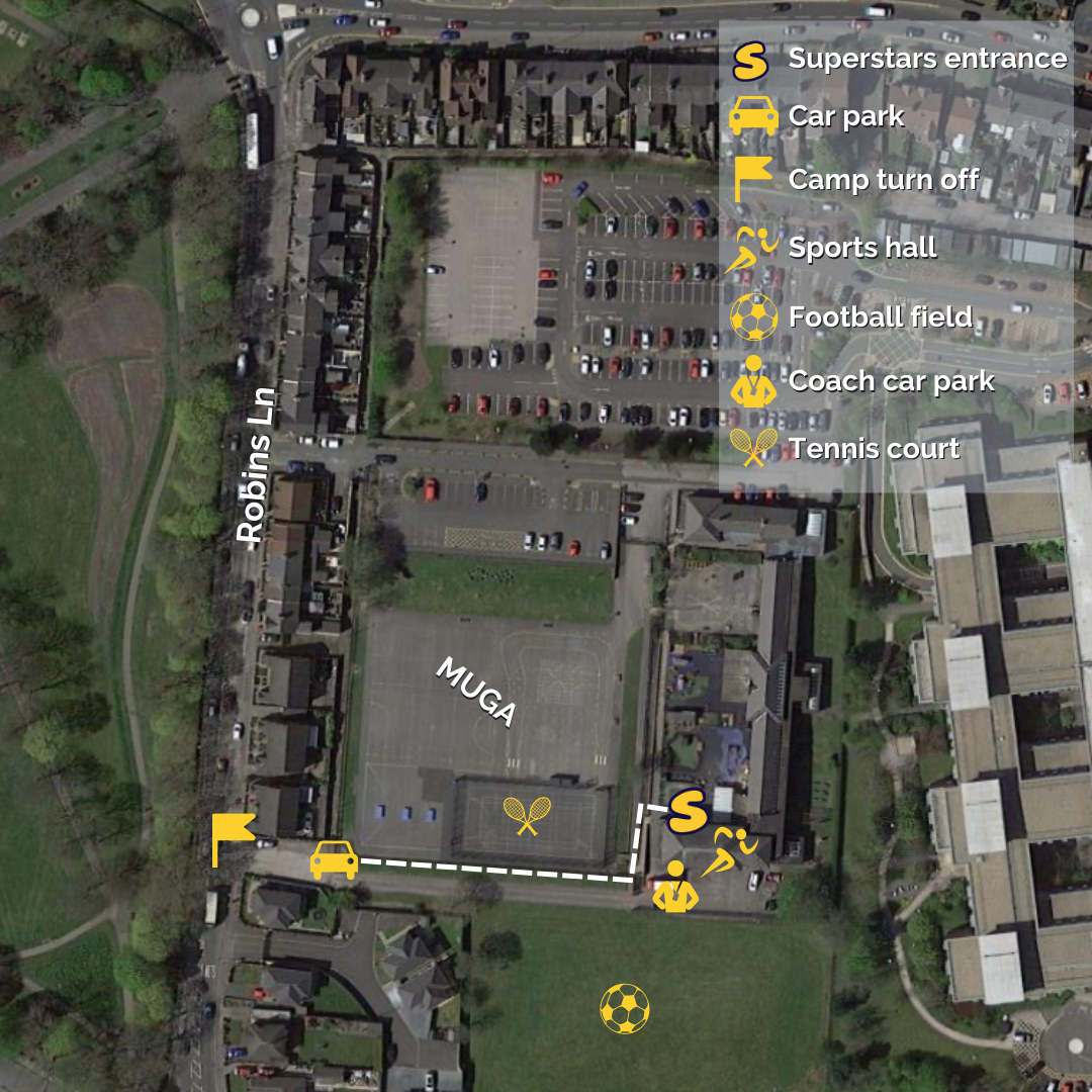 All Drop offs and Pick ups at Robins Lane Primary School take place at the secondary entrance off Robins Ln, not at the main school entrance. We kindly ask for safeguarding reasons that no parent is to enter the building at any point, a Superstars Coach will welcome you and your child before taking them into camp.